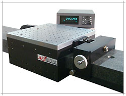 ORS-1000 Air Bearing Optical Radius Slide High Accuracy Linear Straightness -- 1 Meter Travel! ABTech, Inc's precision air bearing linear slides offer a high accuracy solution to the most demanding optical radius inspection applications. The fully captured air bearing carriage offers friction free motion while the natural granite rail provides a stable and straight guide way. The top surface of the moving carriage is a precision ground nickel plated steel platform with 1/4-20UNC-2B tapped holes located on 1.00" centers to accommodate magnetic stands or optical mounts. The optical radius slide has a fine adjustment feature that incorporates a 40 pitch screw with worm gear and hand wheel that allows for precise movements below 1µm steps. A Heidenhain glass scale completes the stage providing position feedback to the operators digital read out display. ABTech's modular design approach and full engineering services can respond quickly to provide a solution to your O.E.M. needs for Ultra-precision linear motion. Click here for high-resolution, printable data sheet (124K PDF) Features Natural granite rail