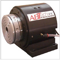 AT-100 Direct Drive Horizontal Air Bearing Table Ultra-Precision Driven Rotary Motion ABTech's model AT-100 air bearing rotary stage provides zero non-repeat error motion combined with a "High Torque", brushless DC servo motor for ultra-smooth and preciserotary motion. The air bearing spindle is constructed of hardened stainless steel for durability and long life, providing added value over conventional aluminum spindles. The spindle motor is designed to accommodate a wide range of precision motion applications such as ultra precision scanning, velocity control, speed regulation and precision indexing with angular step accuracies to ±0.0005° available. Indexing cycles can be variable and range in example from a 0.1° per a 20/30sec move window to a rapid 180°/sec to 360°/sec bi-directional index depending on the encoder resolution and control provided. ABTech's modular design approach facilitates six levels of system packaging to optimize the price for performance required in your application. Some typical applications: Ultra-smooth scanning, Precision velocity & speed control,Sample indexing for image acquisition systems (Goniostat Omega axis), Micro-machining, Optical metrology and circular geometry gages (reference axis). Click here for high-resolution, printable data sheet (200K PDF) Features "Zero" static friction