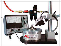 T.I.R. Gages - Air Bearing Spin Table Ultra-Precision T.I.R. Measurements ABTech, Inc. has combined it's model AT100 Precision Air Bearing Rotary Table and Toolroom Style Gage Stand to provide a compact cost effective precision gage for checking total indicated runout. Use in conjunction with any lever or cartridge type indicator or electronic gage head and amplifier depending on the application. Ideal for individual work piece inspection, lens alignment, ID to OD runout and tooling alignment. Multiple gage stands or dual arms can be provided for multi-feature measurements. ABTech's Model AT150, 200, 300 or 400 can be supplied for larger work pieces. Click here for high-resolution, printable data sheet (136K PDF) Features AT-Series air bearing spin table - Reference axis